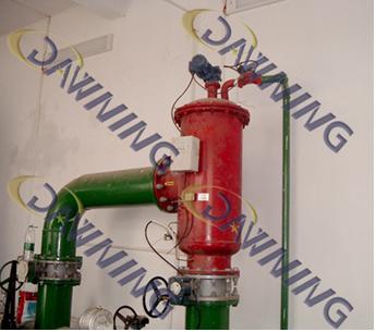 現(xiàn)場(chǎng)安裝圖,圖中立式自清洗過(guò)濾器室內(nèi)安裝,下進(jìn)側(cè)出,右邊小管道與排污口連接方便導(dǎo)出排出的雜質(zhì)。