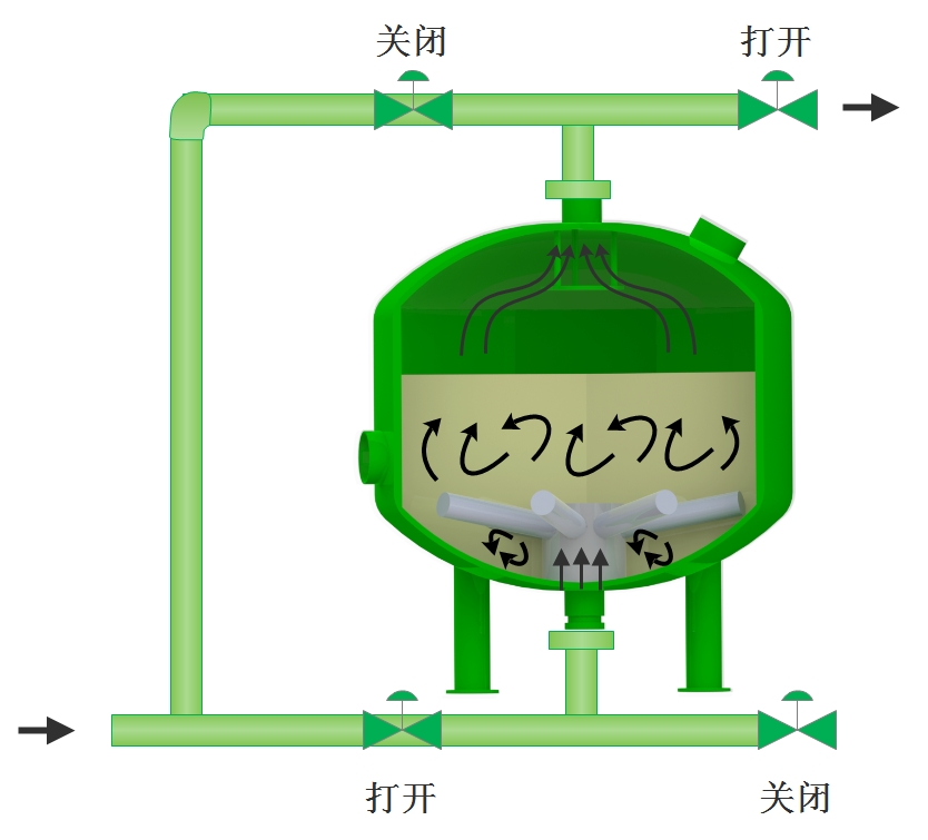 隨時雜質(zhì)在濾料層中不斷聚積,壓力損失不斷增加,當壓差增加到某一設(shè)定值時或到達設(shè)定的清洗時,系統(tǒng)將自動轉(zhuǎn)換至反洗狀態(tài)。加壓水通過集水裝置進入濾料層,對其進行沖刷,使截留的污染物脫落并排出過濾系統(tǒng)。反洗持續(xù)至少2分鐘后,閥門自動將系統(tǒng)轉(zhuǎn)至過濾狀態(tài)。